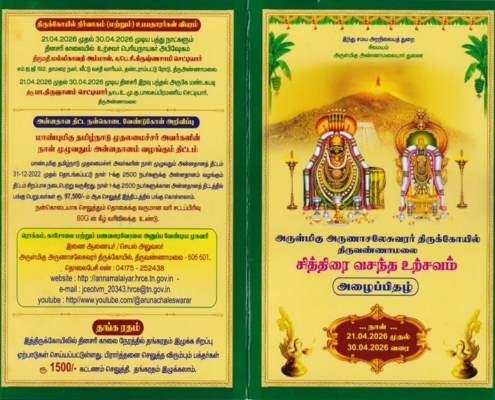0 Comments/in Frontpage Article, News, News & Events/by omarunachalaThe annual Chithirai Vasantha Festival is set to begin at the famous Arunachaleswarar Temple in Tiruvannamalai. As part of the celebrations, the traditional “Pandhakkal” (flag post installation) ceremony will be held on April 20, 2026, in the evening, marking the commencement of the festival. Following this, the Chithirai Vasantha Utsavam will be celebrated from April […]