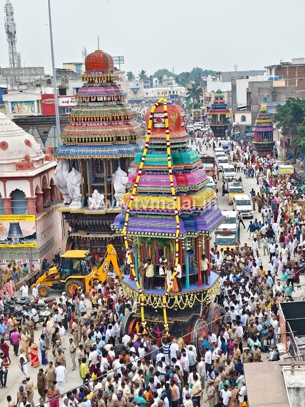 The Parashakti Amman Ther (Chariot) Festival has commenced today at Annamalaiyar Temple in Thiruvannamalai. The chariot, refurbished at a cost of ₹72 lakh and standing 48 feet tall, is being pulled by thousands of devoted devotees, marking the start of the grand festival celebrations.