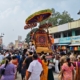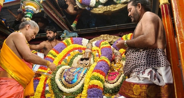 On the first day of the festival, the Panchamurthys were carried on a procession on Mooshikam (mouse), Peacock, Silver Ahikara Nandhi, Hamsam and Simham (lion) respectively around the temple corridor streets offering Darshan to a large crowd of devotee