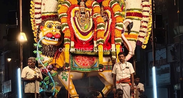 After the special Deeparadhanais, the deities were then taken on a procession from the Thirukkalayana Mandapam, along the Mada Veedhis with the deities of the Lord on the carriage of Simmam (lion) and His Consort Ambal on the carriage of annam (swan), and Lord Chandkeshwara on the carriage of Rishabam (bull).