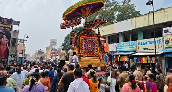 On the second day of the Karthigai Deepam festival in Tiruvannamalai, Lord Vinayakar and Lord Chandrasekar were taken in a grand procession on the golden Surya Vahanam, blessing the large gathering of devotees who had come to witness the divine spectacle.