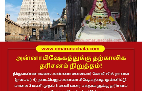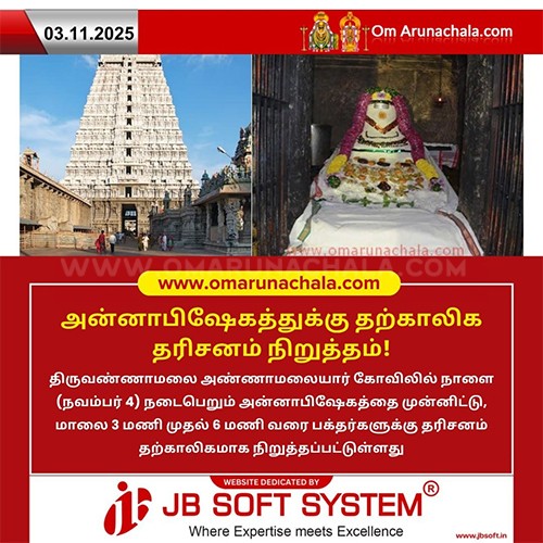 At the Tiruvannamalai Annamalaiyar Temple, darshan for devotees will be temporarily suspended tomorrow (November 4) from 3 PM to 6 PM due to the Annabhishekam ceremony taking place during that time.