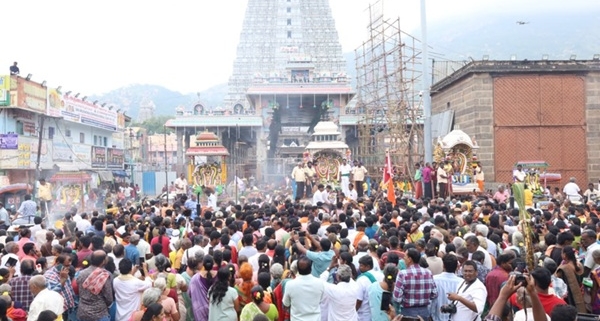 The Thirukarthigai Deepam festival began in Thiruvannamalai with grand celebrations as thousands of devotees gathered around the Annamalaiyar Temple. On the first day of the festival, the Panchamurthi idols were taken out in a special alankaram, carried in beautifully decorated silver vimanas. Devotees thronged the Mada Streets to witness the sacred procession and receive the blessings of Lord Annamalaiyar.